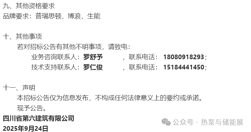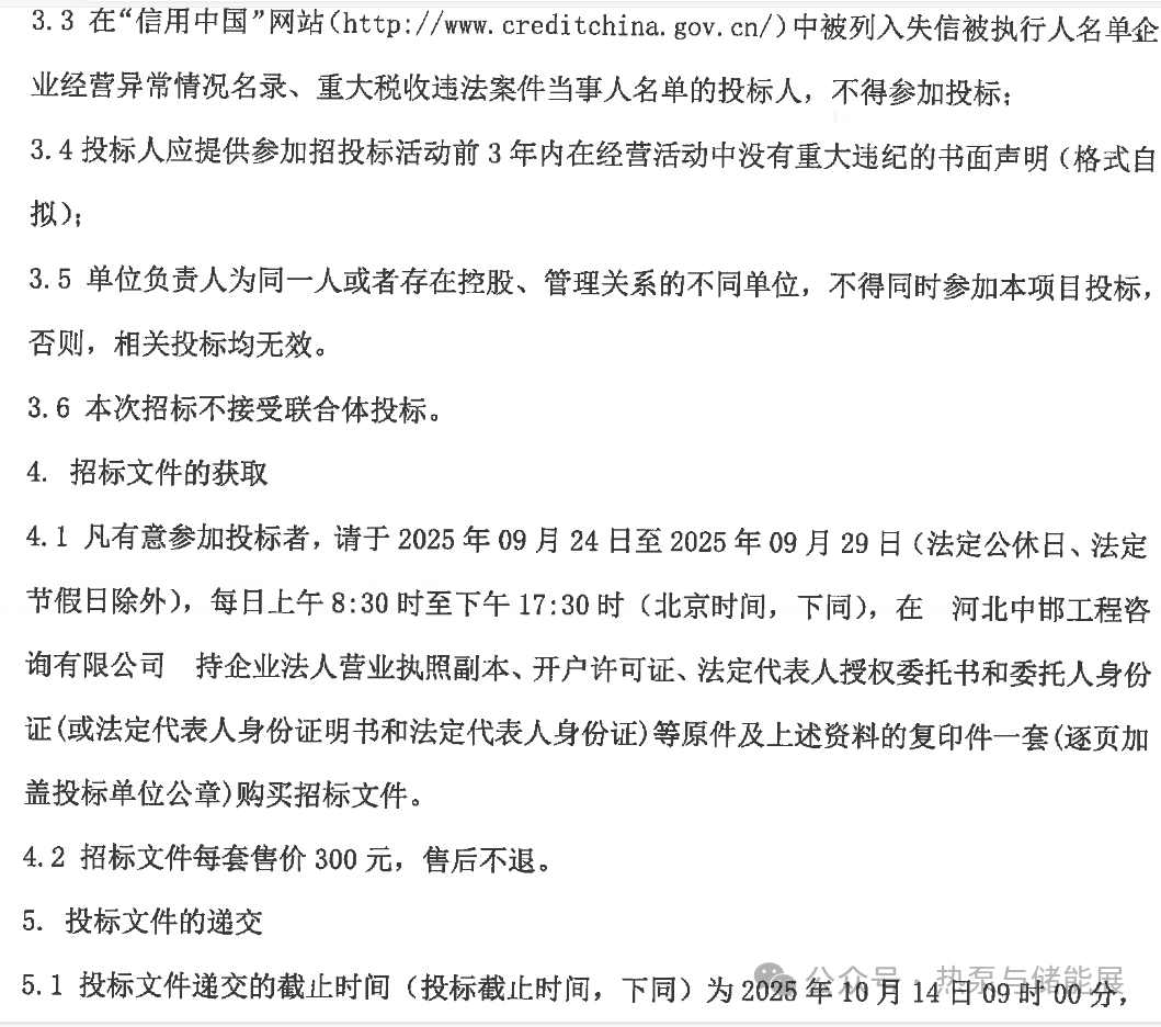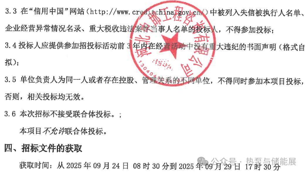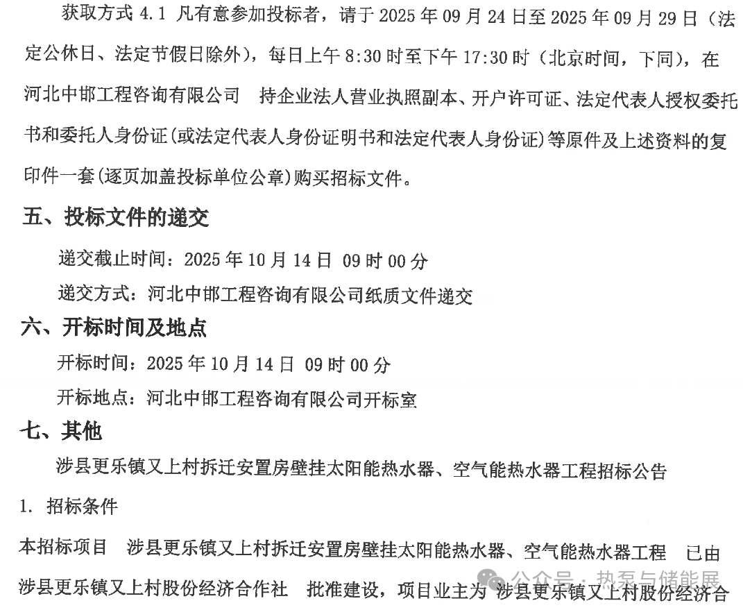 1.采购项目简介 1.1采购项目名称:山西汾西矿业集团正新煤焦有限责任公司贾郭煤矿职工澡堂洗用热水供应服务项目。 1.2采购人:山西汾西矿业集团正新煤焦有限责任公司。 1.3采购项目资金落实情况:已落实。 1.4采购项目概况:提供5台HL20KW型空气能热泵、40组5.8*1800*50型太阳能、专用热水加热130机组和容量60T不锈钢双层保温热水箱及配套附属设施,满足贾郭煤矿职工日常洗浴需求。 2.采购范围及相关要求 2.1采购范围:本采购项目划分为1个标段,本次采购为其中的: 001 第一标段:山西汾西矿业集团正新煤焦有限责任公司贾郭煤矿职工澡堂洗用热水供应服务项目。 2.2服务地点:正新煤焦有限责任公司。 2.3质量要求或服务标准:满足国家、行业标准及采购人相关要求 2.4服务期限:签订合同后1年 3.供应商资格要求 3.1供应商资格要求: 参与本项目采购活动的供应商应当是中华人民共和国境内的法人或非法人组织,同时还应具备如下条件: (1)业绩要求:供应商需提供近三年完成同类型项目至少1项(以合同为准) (2)信誉要求:供应商不得被“信用中国”网站中列入失信被执行人名单;不得被“国家企业信用信息公示系统”中列入严重违法失信企业名单(黑名单); 3.2 供应商不得存在下列情形之一: (1)与本项目其他供应商的单位负责人为同一个。 (2)与本项目其他供应商存在直接控股关系。 (3)与项目其他供应商存在管理关系。 (4)近三年内在经营活动中存在以下严重不良情形: ①被本项目所在地省级以上行业主管部门依法暂停、取消投标或者禁止参加采购活动的。 ②处于被责令停产停业、暂扣或者吊销执照、暂扣或者吊销许可证、吊销资质证书状态。 ③进入清算程序,或被宣告破产,或其他丧失履约能力的情形。 ④根据公司供应商管理要求,被禁止参与采购活动且处于有效期内的。 ⑤其他禁止情形:/ 3.3本次项目不接受联合体参加采购活动。 4.采购文件的获取 4.1 获取时间: 从2025年9月24日10:00至2025年9月28日10:00(北京时间)。 4.2获取方式:参与该项目的供应商需在山西焦煤电子招采平台(www.sxccdzzcpt.cn)完成注册后登录工作台,点击常用应用,通过简易采购(限额以下)进入“交易平台-项目管理-公开项目-参与-我要参与”栏目先参与项目;参与后在交易平台-项目管理-参与项目中进行获取文件获取,因操作失误造成的后果由供应商自行承担。 4.3联系人: 供应商在获取采购文件时务必填写本次采购业务的联系人,在采购过程中的相关信息将以短信形式发送到该联系人手机。 4.4客服电话: 供应商下载采购文件失败或遇到其他问题请拨打客服电话 4000016188-1联系咨询。 5.响应文件的递交 5.1 递交响应文件截止时间及开启时间 2025年9月29 日9时30分(北京时间)。 5.2 递交地址 登录“山西焦煤电子招采平台”(www.sxccdzzcpt.cn)点击常用应用,通过简易采购(限额以下)-交易平台-项目管理-参与项目上传响应文件。 逾期未上传或未完成上传的,平台将拒绝接受其响应文件并自动关闭递交通道;未按指定方法上传的响应文件系统将自动拒绝。 5.3报价方式 本项目采用一或多轮报价方式。 6.谈判方式和地点 登录“山西焦煤电子招采平台”(www.sxccdzzcpt.cn)点击常用应用,通过简易采购(限额以下)-响应开启在线等待通知。 7.发布公告的媒介 本项目采购公告在“山西焦煤电子招采平台”上发布。 8.联系方式 采 购 人:山西汾西矿业集团正新煤焦有限责任公司 地 址:山西省长治市沁源县王和镇古寨村 联 系 人:阴林俊 电 话:18636564366