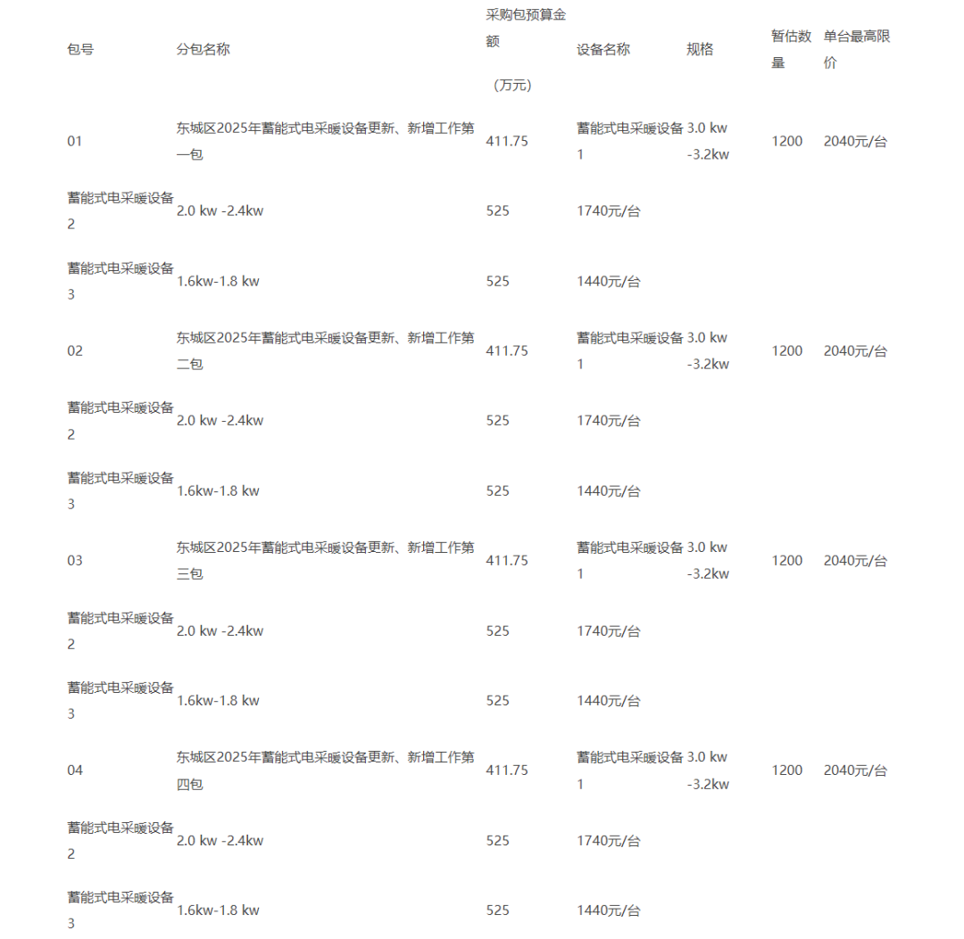简要技术需求或服务要求:按照政策要求,本着政府补贴,居民自愿的原则,为使用满十年(含十年)及十年以上的煤改电居民更换蓄能式电采暖设备,利用峰谷电政策及时段,通过谷电时加热蓄热,峰电时段放热方式降低居民采暖用电成本,确保居民冬季清洁采暖,温暖过冬,巩固东城区无煤化成果。采购要求:项目要求2025-2026采暖季结束前完成,要求中标单位提供质量、安全、环保等方面符合国家标准及要求的与政府采购功率相对应的蓄能式电采暖设备,按照政府要求提供优质售后服务,设备质保期至少5年(质保期内设备故障由厂家免费上门售后服务及维修,不得收取任何费用)并提供至少5年的有偿维保。