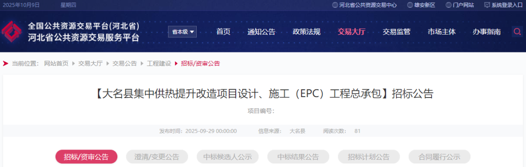 大名县集中供热提升改造项目设计、施工(EPC)工程总承包招标公告 1.招标条件 本招标项目 大名县集中供热提升改造项目设计、施工(EPC)工程总承包 (项目名称)已由 大名县行政审批局 (项目审批、核准或备案机关名称)以 大审批核〔2025〕14号 (批文名称及编号)批准建设,项目业主为大名县暖百家供热有限公司 ,建设资金来自自筹 (资金来源),项目出资比例为100% ,招标人为大名县暖百家供热有限公司 。项目已具备招标条件,现对该项目的设计施工总承包进行公开招标。 2.项目概况与招标范围 2.1项目概况:本项目总投资10206.03万元,其中设计估算价: 60.20 万元;建安工程估算价9855.08万元,建设规模:项目共涉及23个小区,采用浅层地热能利用技术“闭式地源冷热交换系统+地源热泵”系统供热,供热面积134.54万㎡。建设内容包括供热系统及配电系统建设,其中供热系统包括热泵机房内设备及管道建设,室外地热采储系统及热源侧管道建设;配电系统设计包括高、低压配电系统、变压器低压柜引出低压电缆至热泵机组附近配电箱,由配电箱配出的低压电缆至设备的配电等。建设地点:大名县主城区。 2.2招标范围:承包人按照发包人要求,完成本项目的所有工程设计(含初步设计、施工图设计、施工现场指导、工程调整和竣工验收、保修期的设计服务等)、施工(包含本工程涉及范围内所有工程内容的施工、设备采购安装及调试、竣工验收、联合验收、交付、竣工备案及整体移交,并配合发包人办理报建、报批、相关部门结(决)算审计、工程保修等工作,满足项目使用功能,并达到合同约定及相关验收标准)。本次招标最高投标限价:9915.28万元 。 2.3 计划工期:365日历天(其中:设计工期:15日历天、施工工期:350日历天)。 2.4 质量要求:设计要求的质量标准:符合国家现行相关规范的要求;施工要求的质量标准:合格。