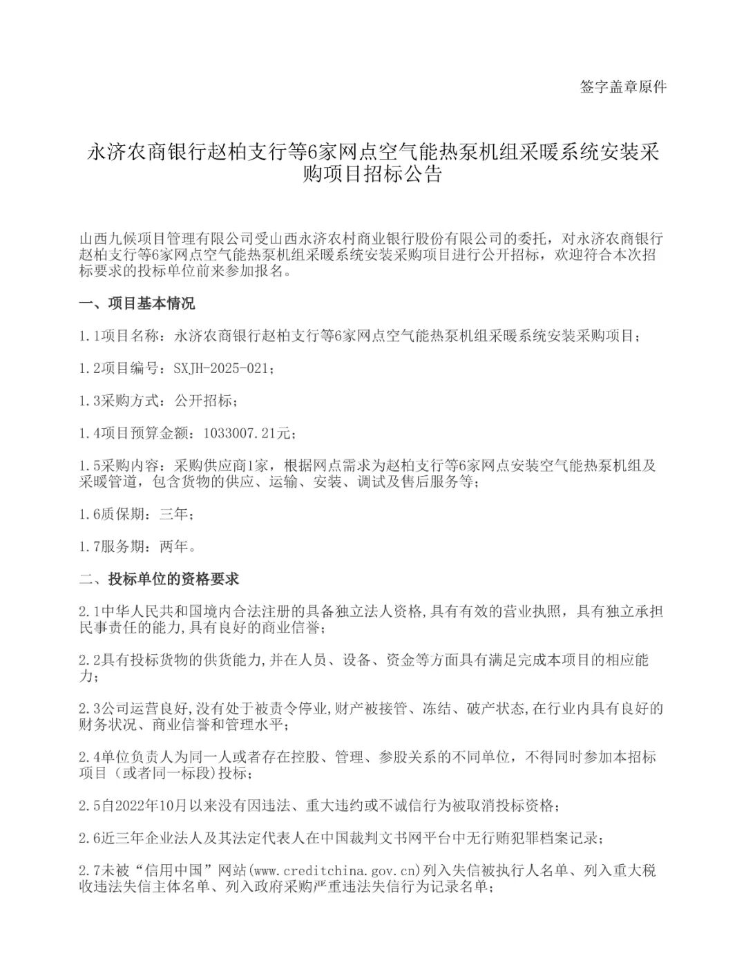 永济农商银行赵柏支行等6家网点空气能热泵机组采暖系统安装采购项目招标公告