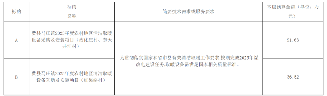项目名称:费县马庄镇2025年度农村地区清洁取暖设备采购及安装项目