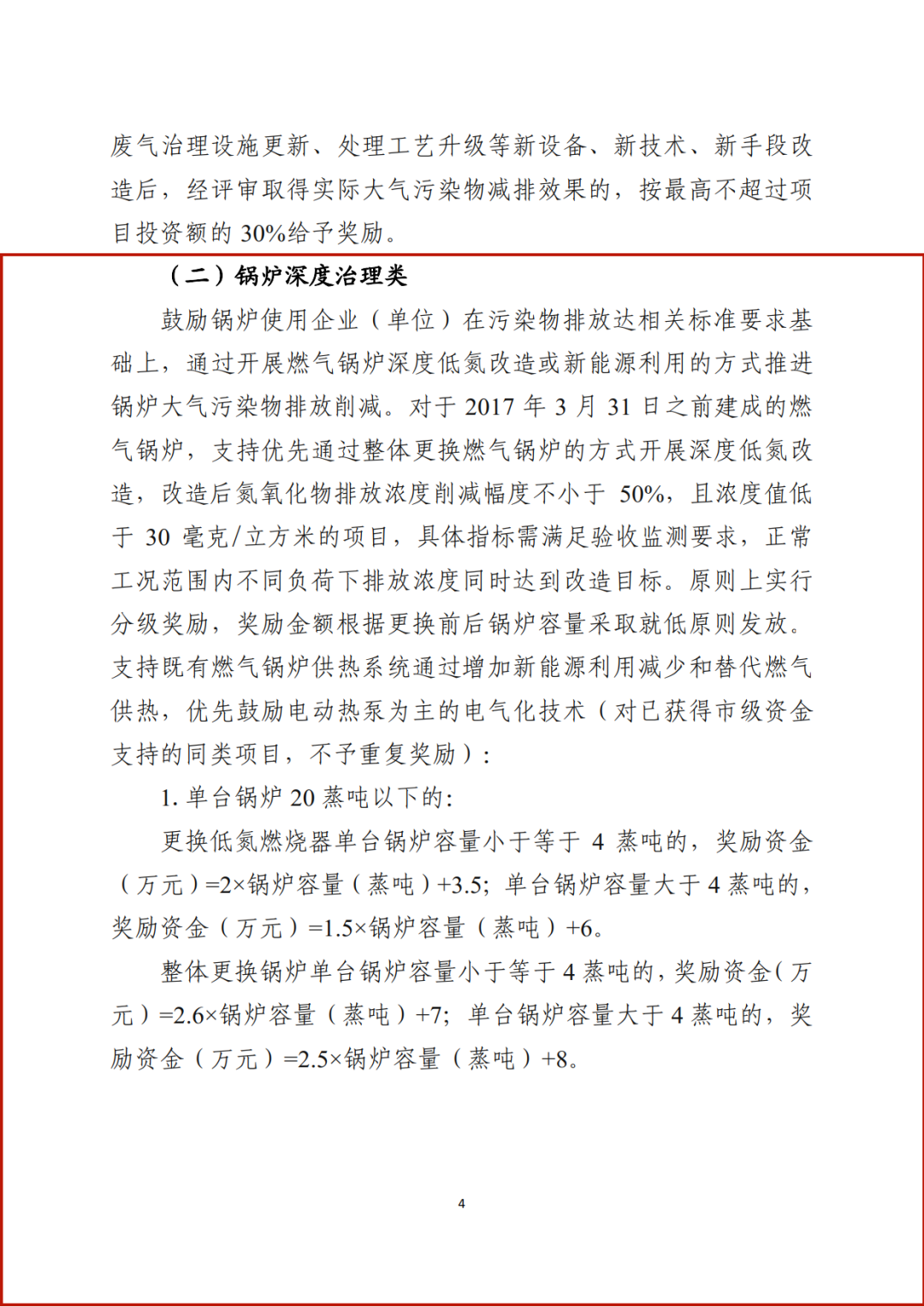 支持既有燃气锅炉供热系统通过增加新能源利用减少和替代燃气供热,优先鼓励电动热泵为主的电气化技术(对已获得市级资金 支持的同类项目,不予重复奖励)。单台锅炉20蒸吨及以上和新能源利用的,改造后取得实际大气污染物减排效果的,按最高不超过项目投资额的30%给予奖励。