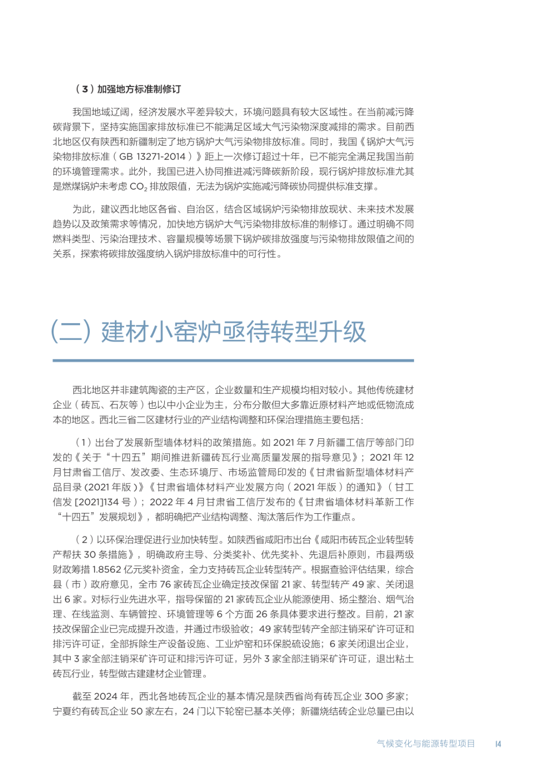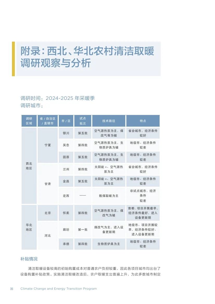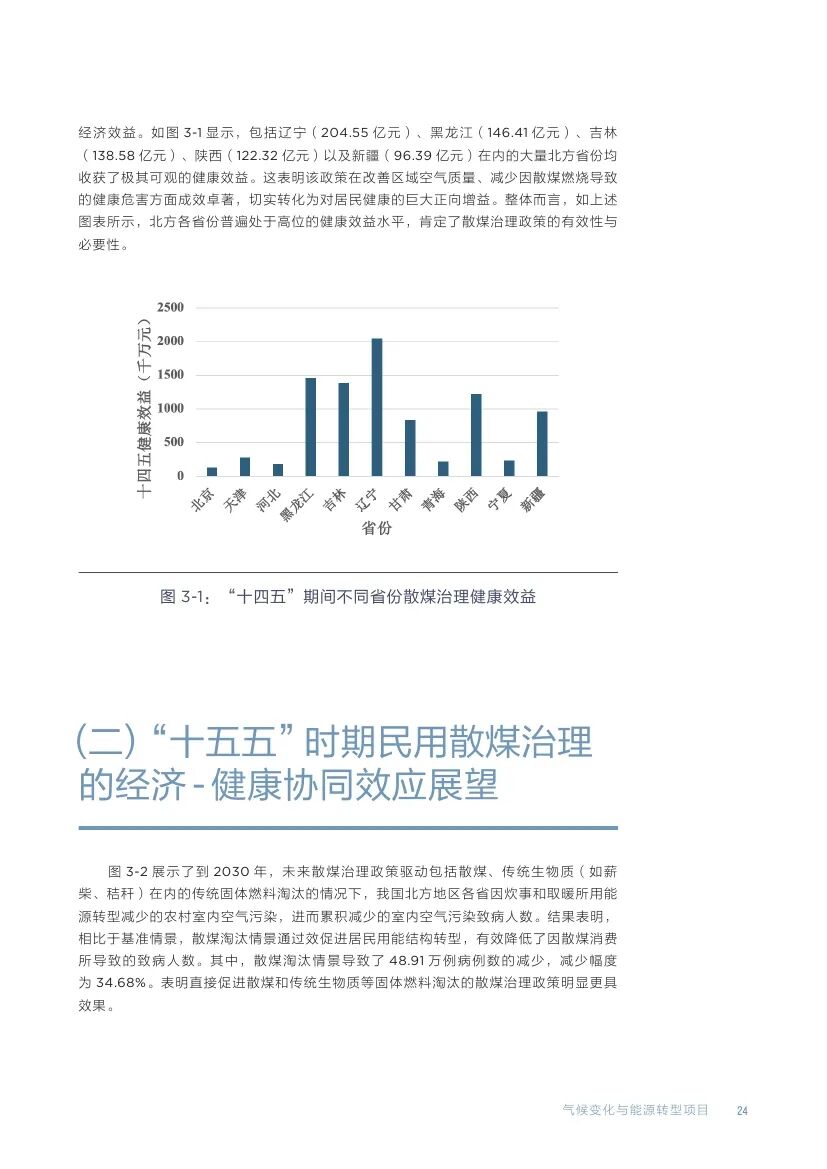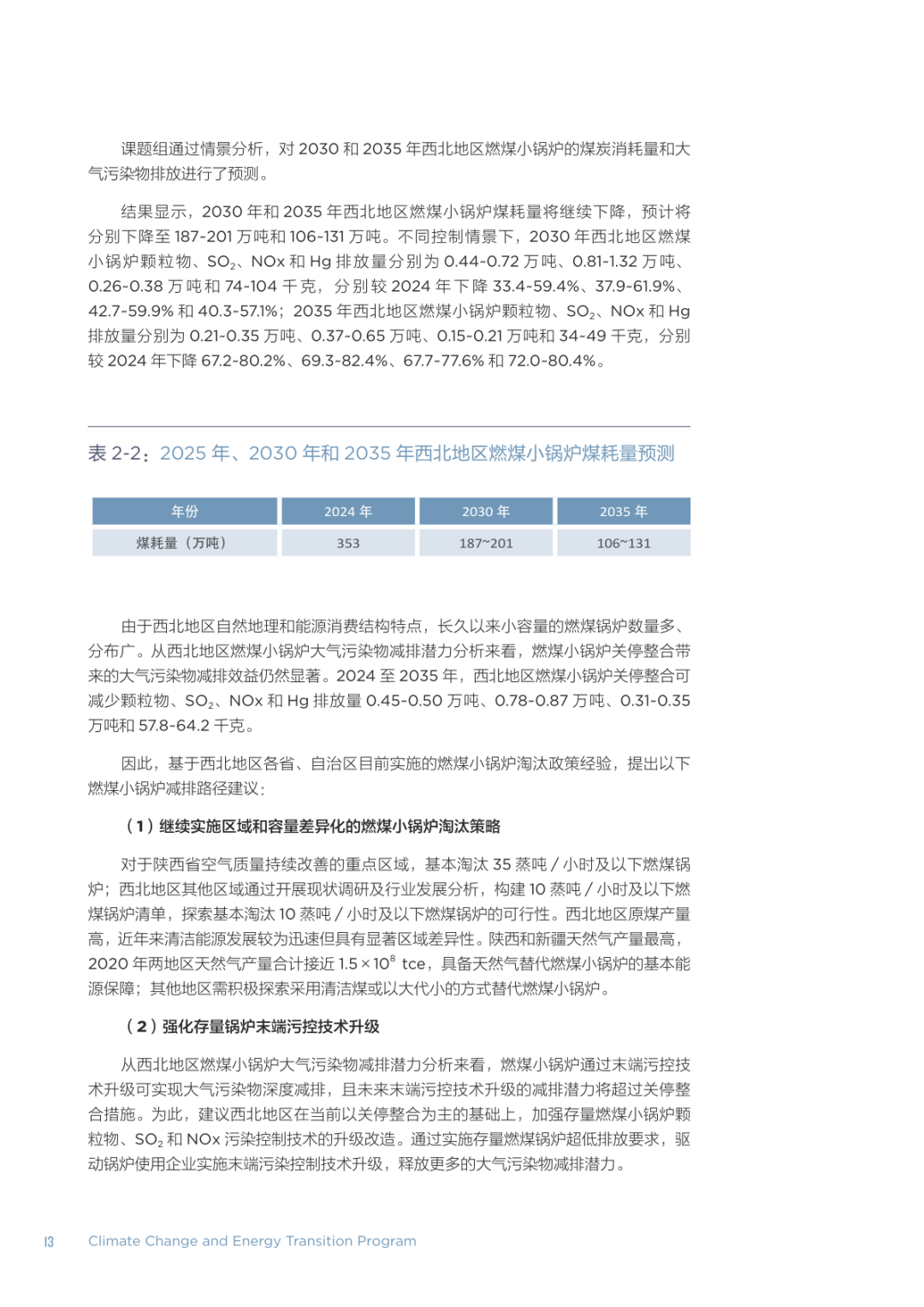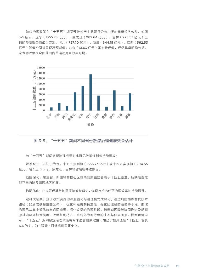 报告聚焦 “十四五” 散煤治理成效、区域特征与经济健康协同效应,提出农村清洁取暖与能源转型路径,为 “十五五” 治理提供方向。报告先总结 “十四五” 治理成果。全国散煤削减超 4 亿吨,PM2.5 平均浓度降至 30 微克 / 立方米以下。工业小锅炉散煤消费从 2017 年 1.55 亿吨降至 2024 年 0.28 亿吨,35 蒸吨 / 小时以下锅炉成淘汰重点;建材小窑炉减少散煤 1.99 亿吨,砖瓦行业淘汰 5401 家企业;北方农村清洁取暖改造 4100 万户,清洁取暖率达 83%,可再生能源采暖替代散煤 2102 万吨,地热占比 62%。核心内容围绕西北地区治理与协同效应展开。西北地区工业小锅炉 2024 年煤耗 353 万吨,预计 2035 年降至 106-131 万吨,需差异化淘汰与末端治理升级;建材小窑炉企业数量锐减,但剩余产能能效低,需推动清洁能源替代;农村清洁取暖率 25%-30%,受严寒、经济弱等制约,返煤率 50%-80%,需适配技术与建筑节能协同。