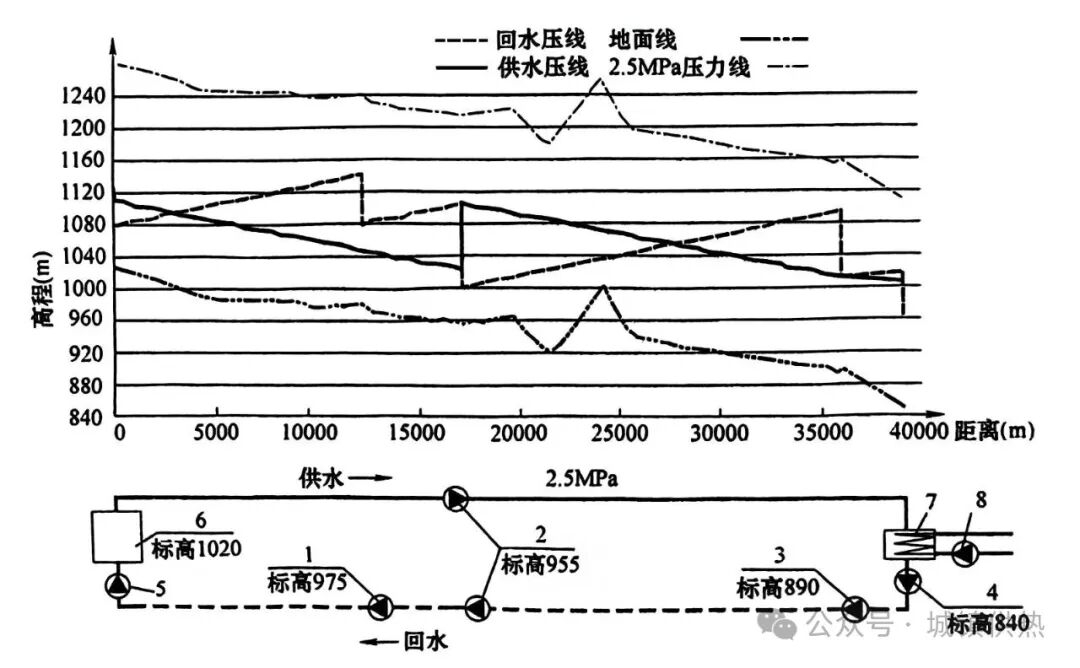 图4是利用太原市古交电厂抽汽和乏汽对太原市进行集中供热的太古长输管线中继泵站及其水压示意图。从古交电厂至太原市城区周边隔压站单程管线长度37.8km,复线DN1400管道,即2根供水管道、2根回水管道。古交热电厂在高处,高出隔压站180m,且沿途地势起伏较大,地形复杂,为了控制管网设计压力在2.5MPa范围内,沿途建设了四座中继泵站,总计5组加压泵串联。其中1号、3号和隔压站等加压泵组都安装在回水管道上,2号中继泵站有两组加压泵,分别安装在供、回水管道。把热源首站循环泵计算在内,该长输管线总共6组泵串联运行。