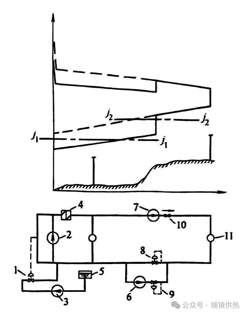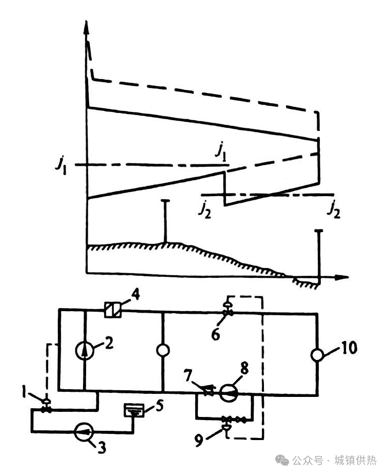 在供水干管上设置加压水泵,可降低热源出口供水管的压力;同时,通过加压水泵增压,同样可以保证后部网路的高温水不汽化。“阀前”压力调节器起着节流、降低前部网路回水管压力的作用。在网路循环水泵和加压水泵停止运转时,同样需要将网路截断为两个区域,维持不同的水静压线。供水干管上的止回阀10起着保护前面用户免受后面网路的高水静压线的作用。又由于回水干管压力下降,当压力下降到静压力线j₂-j₂的位置时,“阀前”压力调节器8自动关闭。从而实现了将网路分成压力状况不同的两个区域的目的。前面网路的静水压线j₁-j₁,靠热源的补给水泵3和补水调节阀1来保证。后面网路的静水压线j₂-j₂,靠泵站补给水泵6和补水调节阀9来保证。泵站补给水泵6的扬程应为j₂-j₂与j₁-j₁两条静水压线之间的差值。