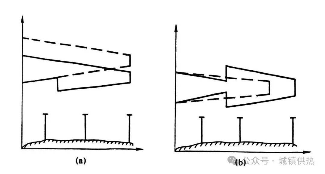 图1(b)是原有热水网路扩建的例子。由于扩建接入了许多用户,网路流量增大。在管径不改变的情况下,网路的动水压曲线坡度增加,后部用户的资用压头和流量就显得不足了。这可根据具体情况,在供水干管、回水干管,或者在供、回水干管上设置加压水泵来解决。图1(b)中虚线表示原有的网路水压图。实线表示在供水干管和回水干管都设置加压水泵,并扩大了供热范围的水压图。