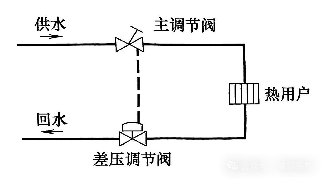 差压调节阀的基本原理,类似自力式平衡阀(流量限制阀),只是调节阀本体没有节流圈装置,而是把热用户作为节流圈(见图1所示)。安装差压调节阀时,预先设定好热用户所需资用压头,即差压调节阀的设定压差。在系统运行期间,由于热用户内部用热需求的变化,引起热用户资用压差也发生变化,此时差压调节阀的调节功能发挥作用、保持热用户资用压头维持设定值不变,这时通过差压调节阀的流量发生变化,借以满足热用户变化了的用热需求。