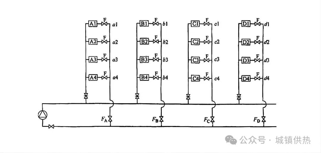 图中的双管闭式热水供热系统,有一条输配干线和4条支线A、B、C、D,每条 支线有4个热用户,用户入口回水管、各支线在主干线分支点回水管上和主干线供水管等都分别安装了平衡阀。