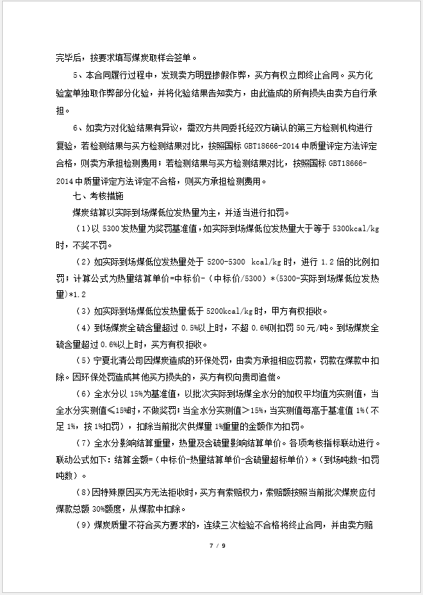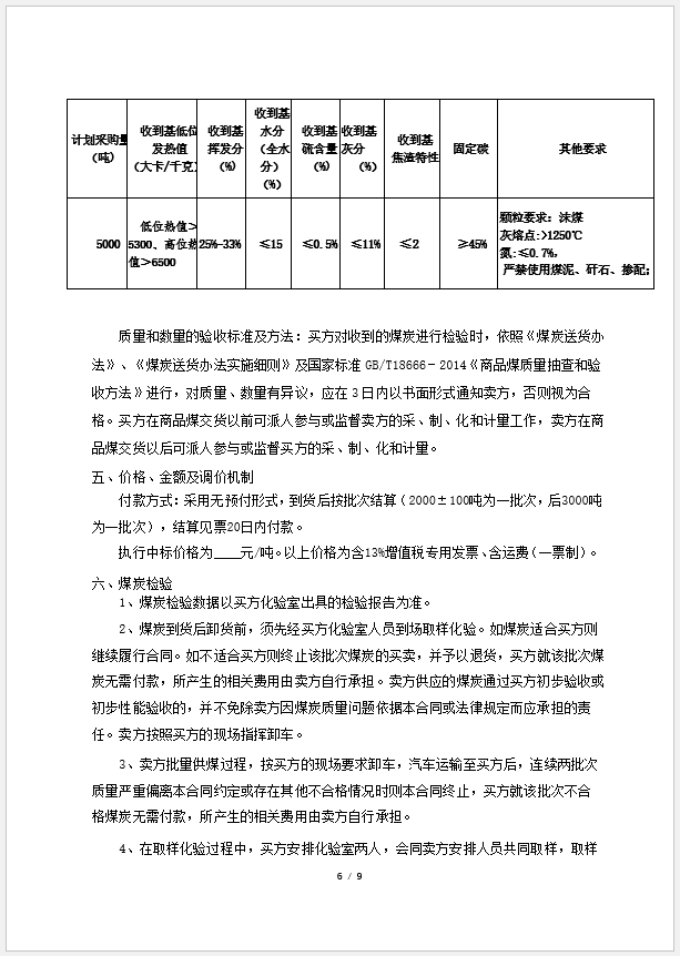 四 煤炭指标及计划采购煤量 相关要求 计划采购量(万吨) 0.5 低位热值>5300、高位热值>6500 收到基挥发分(%) 28~33 收到基水分(全水分)(%) ≤15 收到基硫含量(%) ≤0.5 灰分(%) ≤11 焦渣特性 ≤2 固定碳(%) ≥45 其他要求 颗粒要求:沫煤 灰熔点:>1250℃ 氮:≤0.7% 严禁使用煤泥、矸石、掺配 1. 到宁夏盐池县高沙窝工业园煤炭报价含税运,税率13%,一票制。 2. 设立指标考核条款。煤炭检验数据以买方化验室出具的检验报告为准。详见合同。 五 报价要求 1.本次挂牌竞价要求如下: a) 供应商报名:请扫描上方二维码进入报名主页,建议使用微信PC端进行操作; b)发送报价单(可编辑版、扫描件)至集团监察审计邮箱: ztbsj@shne.net.cn 邮件主题要求:宁夏北清挂牌竞价-煤炭报价单-XXXX公司 报价单模板见附件一 c)供应商报名和报价单发送需在截止报名时间前完成。 d)如二维码登录上传不成功,请把报名信息与报价单发送至上述集团监察审计邮箱。 2.其他要求见附件二 合同 3.如在操作过程中有任何问题,请联系 王女士 13810310735