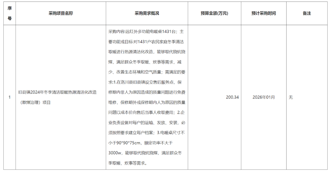 采购需求:为积极推进泰山区财源街道城中村清洁取暖改造,提高清洁取暖设备使用率,拟对清洁取暖设备进行采购,具体内容详见采购清单。