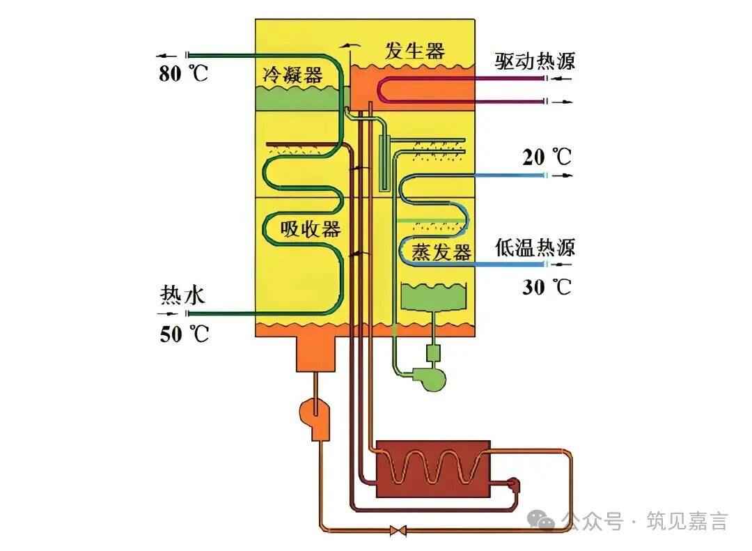 以热能(燃气、蒸汽或热水等)驱动吸收式溴化锂热泵产生低温水并送入烟气换热器,低温水经过烟气换热器回收锅炉排烟余热,经热泵提升后送往热网,它可有效回收锅炉排烟的低品位余热,原理如下图所示: