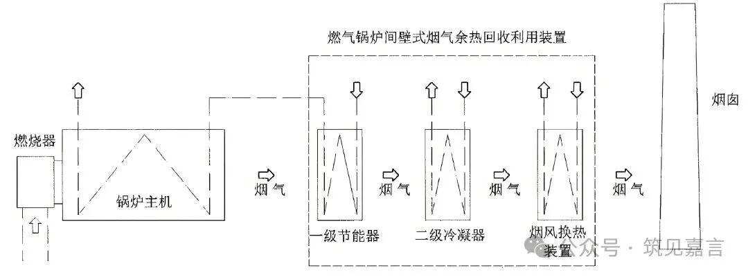 注1、一级节能器:用45℃~70℃一次管网回水与110℃~150℃的锅炉主机出口烟气换热,节能器后烟温降至55℃~75℃,回收烟气显热。