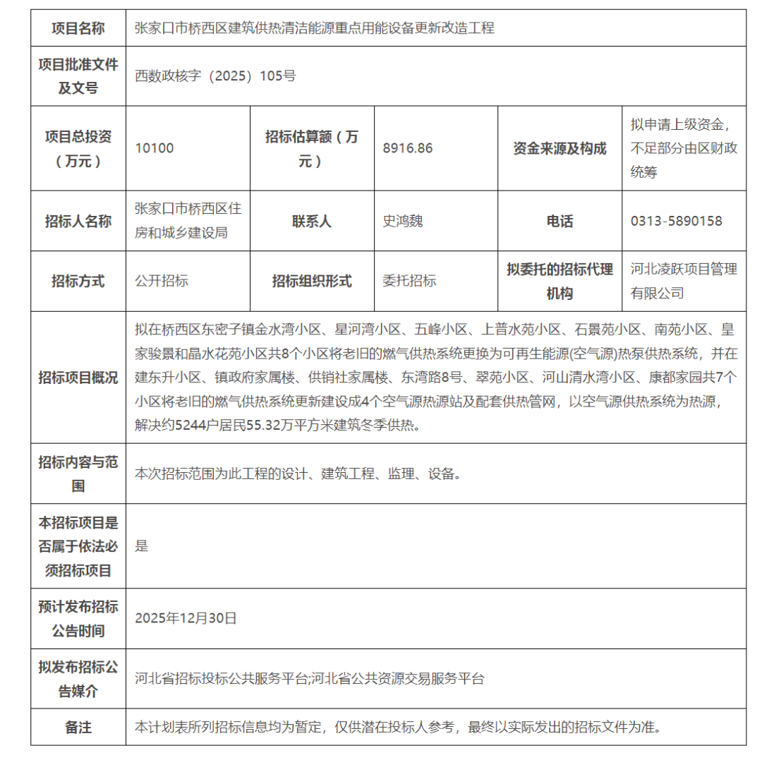 张家口市桥西区建筑供热清洁能源重点用能设备更新改造工程招标计划