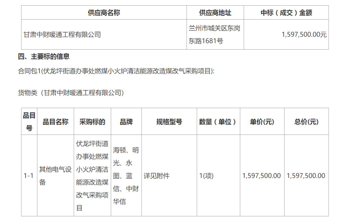 兰州市城关区人民政府伏龙坪街道办事处燃煤小火炉清洁能源改造煤改气采购项目成交公告