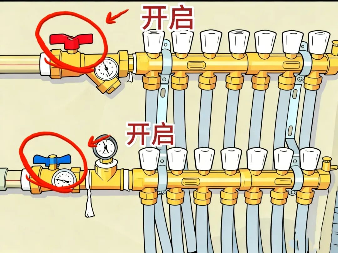 如果确定问题出在自家,请按以下顺序进行检查,多数常见问题都能自行解决。 01 检查阀门:确保“水路”畅通 首先确认暖气管道的进水阀和回水阀是否已经完全打开。阀门手柄的方向与管道平行时为开启状态,垂直时为关闭状态。这是最基础却最容易被忽略的一步。 阀门与管道平行为开启 阀门与管道垂直为关闭 顺时针转为关闭 逆时针转为开启