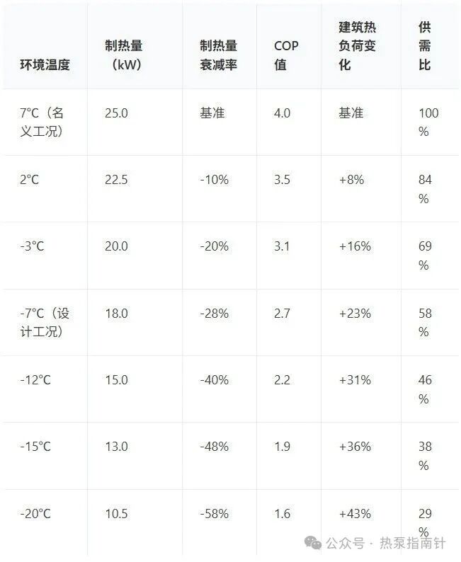 为更清晰地展示这一性能衰减规律,下表列出了典型空气源热泵机组在不同环境温度下的性能参数: