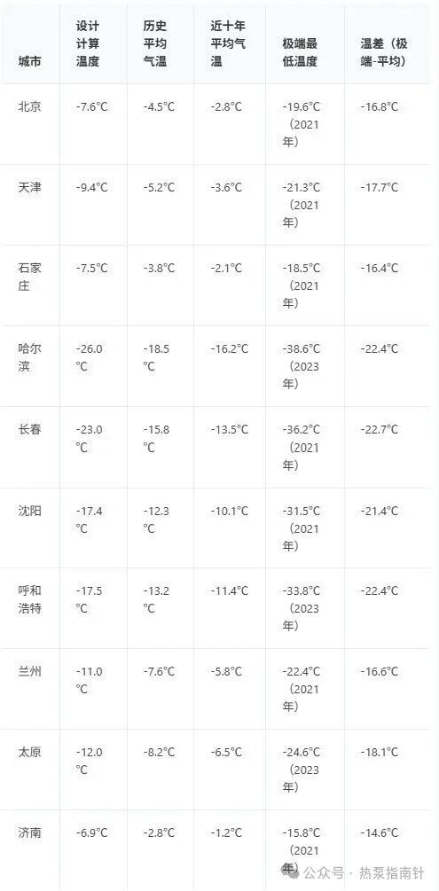 从表中可以清晰看出:近十年平均气温较历史值普遍升高1.5℃至2.5℃,印证了暖冬态势;但极端最低温度与近十年平均气温的温差高达14℃至23℃,远超设计计算温度与平均气温的差值。这一"剪刀差"正是导致空气源热泵系统在极端天气下失效的关键所在。