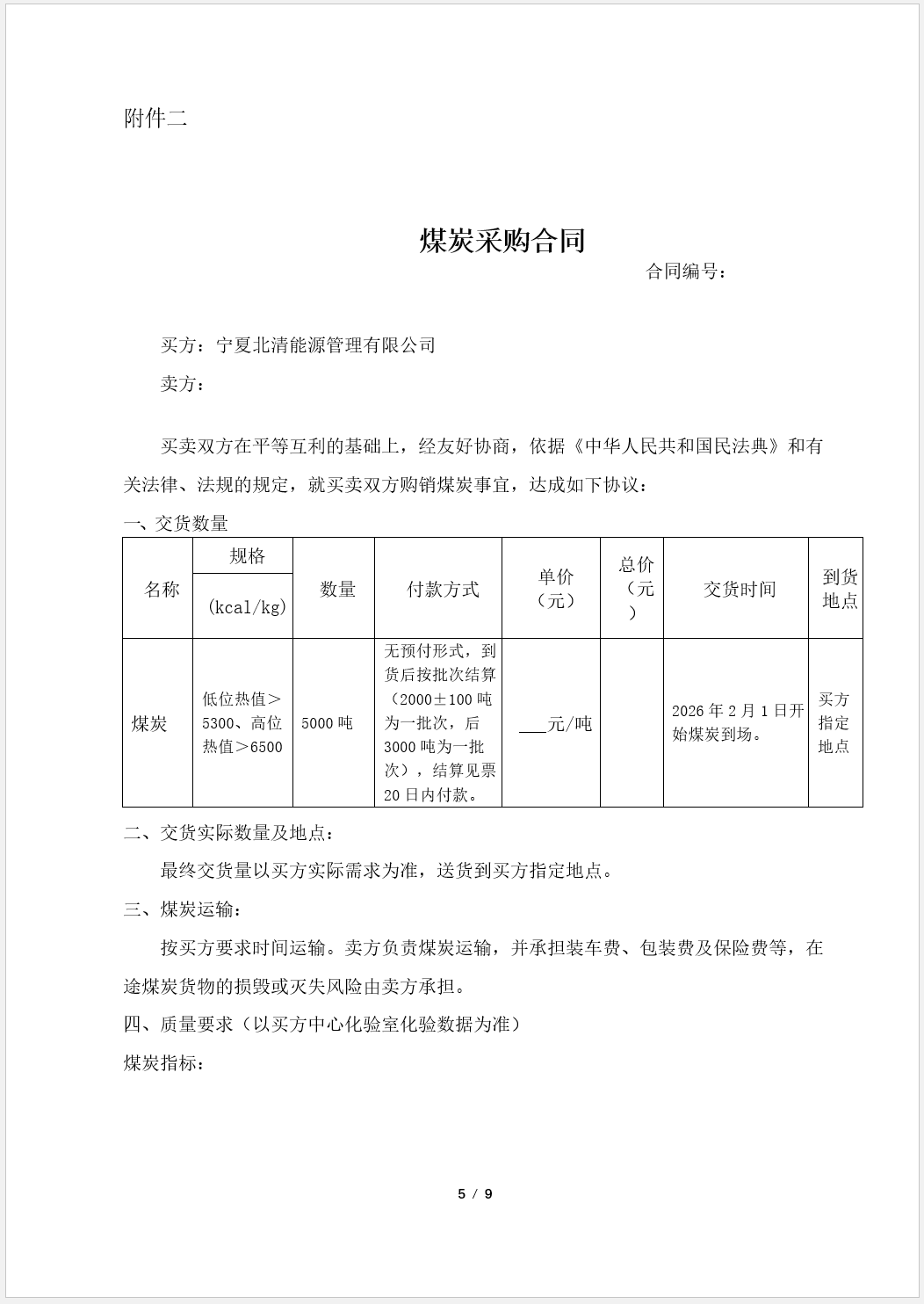 四 煤炭指标及计划采购煤量 相关要求 计划采购量(万吨) 0.5 低位热值>5300、高位热值>6500 收到基挥发分(%) 25~33 收到基水分(全水分)(%) ≤15 收到基硫含量(%) ≤0.5 灰分(%) ≤11 焦渣特性 ≤2 固定碳(%) ≥45 其他要求 颗粒要求:沫煤 灰熔点:>1250℃ 氮:≤0.7% 严禁使用煤泥、矸石、掺配 1. 到宁夏盐池县高沙窝工业园煤炭报价含税运,税率13%,一票制。 2. 设立指标考核条款。煤炭检验数据以买方化验室出具的检验报告为准。详见合同。 五 报价要求 1.本次挂牌竞价要求如下: a) 供应商报名:请扫描上方二维码进入报名主页,建议使用微信PC端进行操作; b)发送报价单(可编辑版、扫描件)至集团监察审计邮箱: ztbsj@shne.net.cn 邮件主题要求:宁夏北清挂牌竞价-煤炭报价单-XXXX公司 报价单模板见附件一 c)供应商报名和报价单发送需在截止报名时间前完成。 d)如二维码登录上传不成功,请把报名信息与报价单发送至上述集团监察审计邮箱。 2.其他要求见附件二 合同 3.如在操作过程中有任何问题,请联系 王女士 13810310735