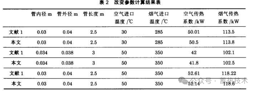 从上面的比较可以发现,应用本文提供的计算公式计算所得的结果的精确度高于文献[1]中的计算结果的精确度。为了证明其正确性,笔者通过改变空气预热器的结构参数和进入空气预热器介质的温度,进行多次计算和比较,证明利用本文提供的计算公式所得的结果比利用文献[1]提供的计算公式所得的结果更为精确。改变有关参数的计算结果见下表2。
