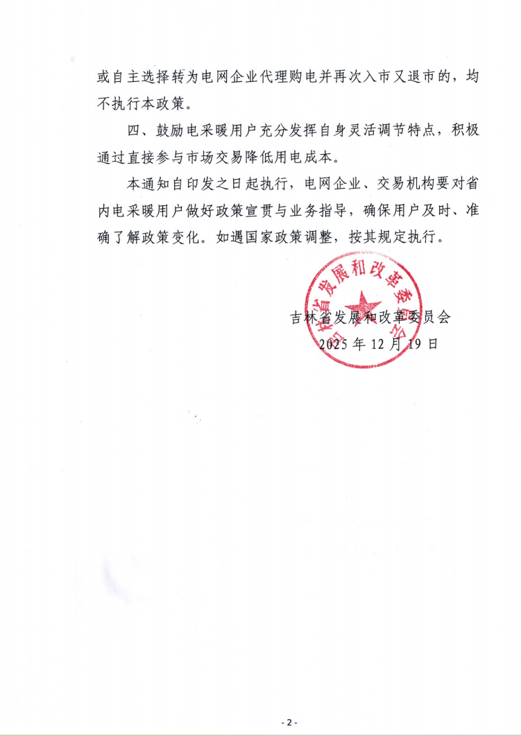 2025年12月25日,吉林电力交易中心转发《吉林省发展改革委关于明确电采暖价格相关事项的函》。