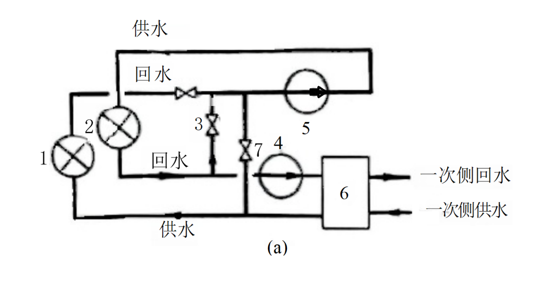 若地暖用户有一定规模,且散热器总回水量大于地暖回水量、回水温度刚好等于地暖供水温度,可在热源处增设地暖循环水泵,采用四管制的方式,分别为散热器和地暖用户供热。