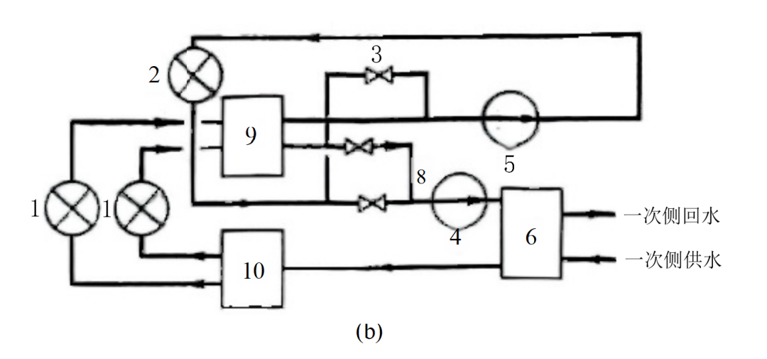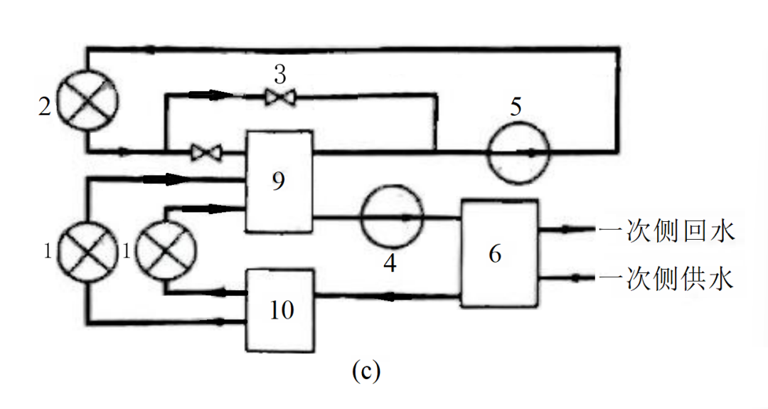 当小区里散热器用户仍占主体,但地暖用户的数量达到一定规模时,就需要在热力站内单独设置一组换热器,再集中配备混水泵,同样采用四管制的方式,分别为两种用户提供符合需求的供热。
