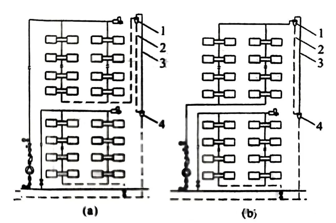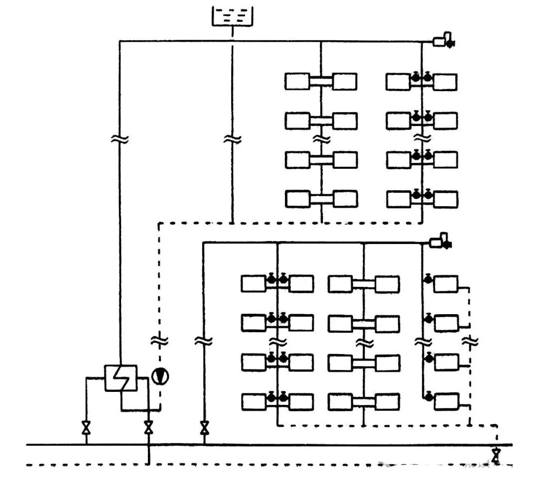 如果把散热器沿垂直方向分成若干组,每组内部用双管形式,组与组之间用单管连接,就组成了单、双管混合式系统(如图2)。