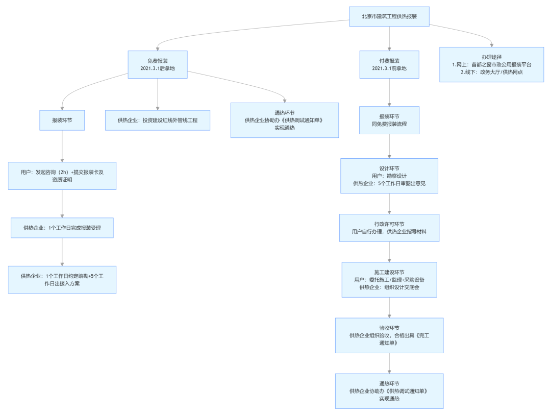 供热报装是用户向供热企业申请接入供热系统,将建筑内供暖设施与室外供热管网相连接的管道工程,涵盖勘察设计、土方开挖、管道安装等事项,属于市政工程类别,其报装类型按土地使用权取得时间分为免费和付费两类,办理流程各有规范,具体如下: