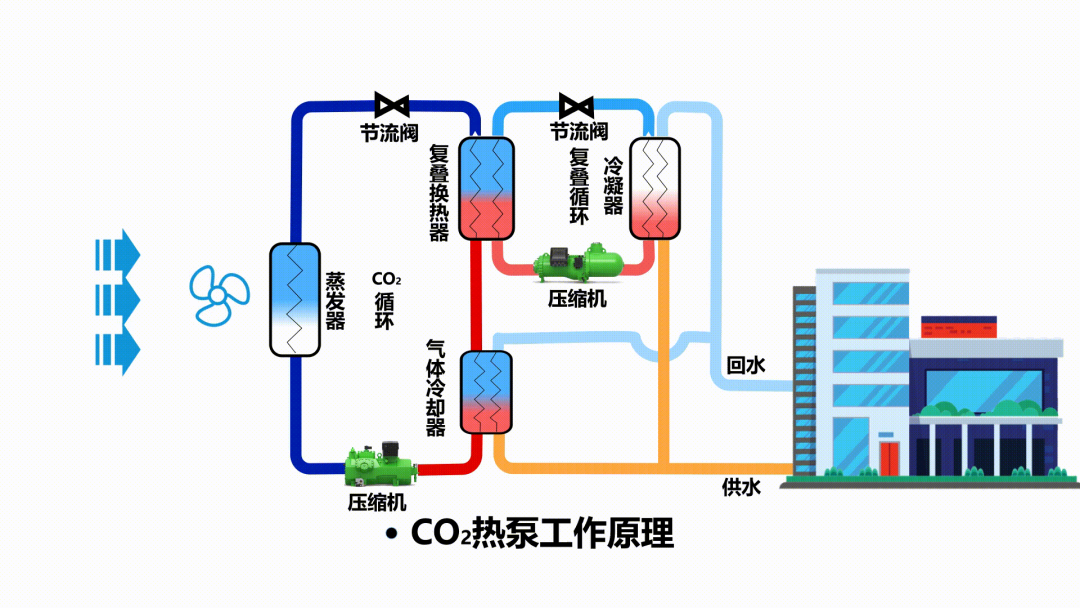 7 | 空气源 | 跨临界CO2热泵的并行复合循环关键技术 | 热泵压缩机把低温低压气态CO2压缩成高压高温的气态,与水进行热交换,高压的CO2在常温下被冷却、冷凝为液态,再经过蒸发器(空气热交换器)吸收空气中的热能,由液态CO2变为气态CO2,低温低压的气态CO2再由压缩机吸入,压缩成高压高温气态CO2。如此往复循环,不断地从空气中吸热,在水侧换热器放热,制取热水。 | 国家工业节能技术推荐目录(2021) |
