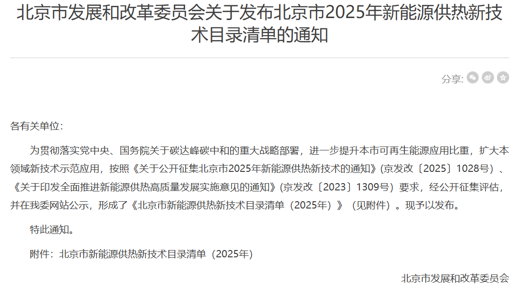 随着技术进步,未来新能源供热必将是供热的重要支撑力量。北京市发展改革委发布《北京市新能源供热新技术目录清单(2025年)》,8项具有先进性、创新性、节能降碳效果显著的新能源供热技术入选。